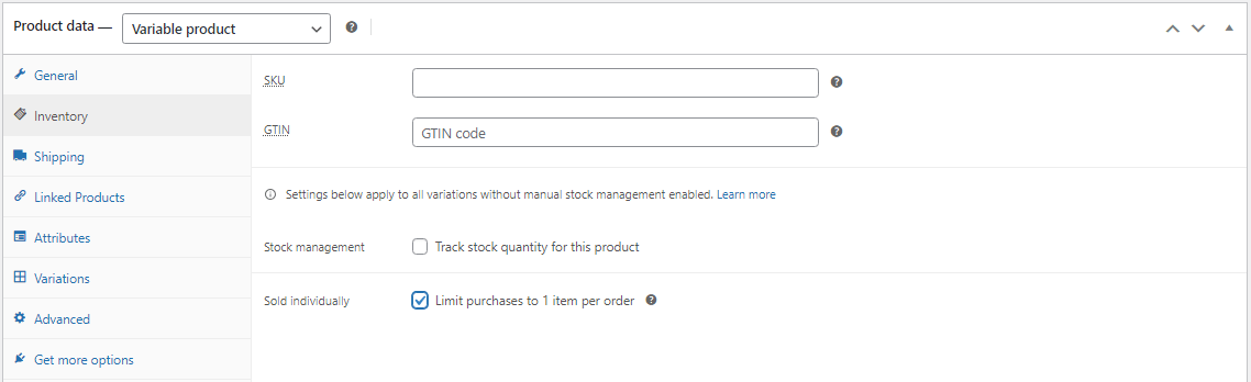 Click on the Inventory tab and checkmark the option of Sold Individually. This will allow customers to purchase a single item at a time by disabling the quantity change feature.