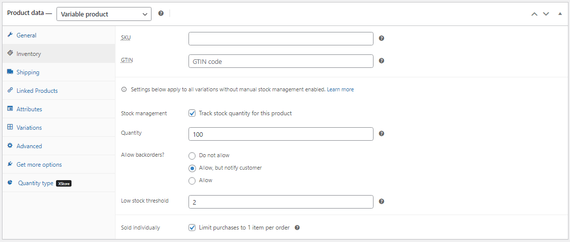 First, go to WordPress dashboard > Products and open the product on which you want to hide the quantity change feature. Scroll down till you see the following screen: